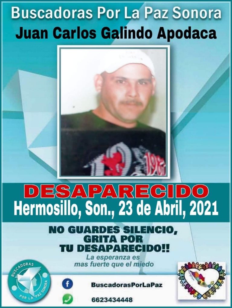 Por favor ayuden a localizarlo, la familia tiene el corazón destrozado... desapareció el 22 de abril de 2021 en Hermosillo, Sonora.. se llama Juan Carlos Galindo Apodaca y tiene 35 años... por favor lo queremos de vuelta", se lee en Facebook.