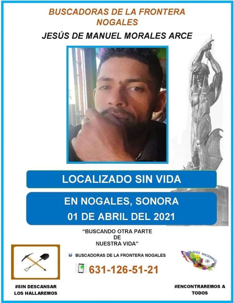 Nogales, Sonora.- El colectivo Buscadoras de la Frontera Nogales informó que el cuerpo sin vida de Jesús de Manuel Morales Arce fue encontrado, tras varios días en lo que permaneció en calidad de desaparecido en su natal Nogales.