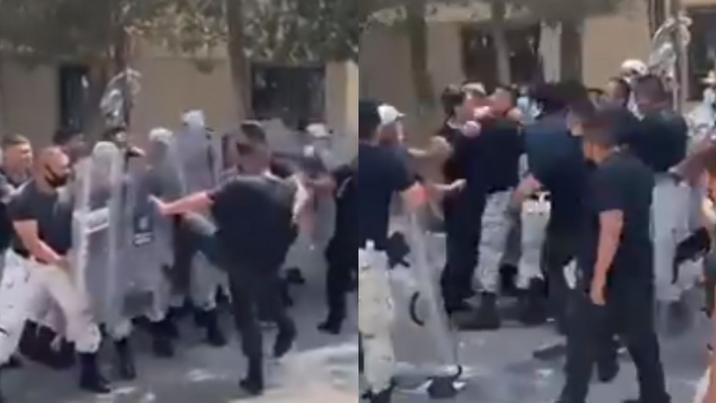 Al inicio, el ensayo se desarrollaba de forma ordenada, sin embargo, la dinámica se descontroló cuando un individuo intentó arrebatarle la barrera de protección a uno de los policías. En respuesta, el atacado jaloneó a su compañero.