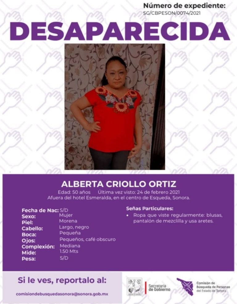 Fronteras, Sonora.- Este miércoles 28 de abril, se hizo pública la lamentable desaparición de Alberta Criollo Ortiz, mujer de quien no se sabe nada desde hace más de 2 meses cuando se encontraba en el municipio de Fronteras, Sonora.