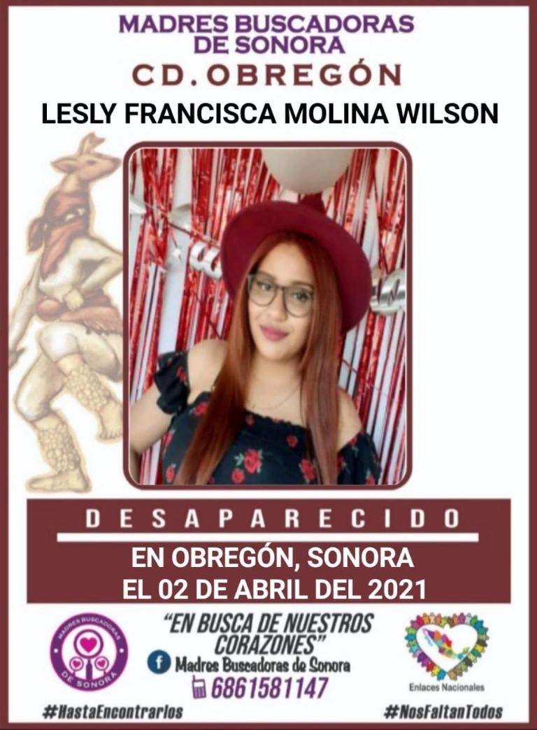 Ciudad Obregón, Sonora.- Este sábado se confirmó que Lesly Francisca Molina Wilson, joven que había sido reportada como desaparecida en Ciudad Obregón, fue localizada sana y salva y ya se encuentra junto a su familia.