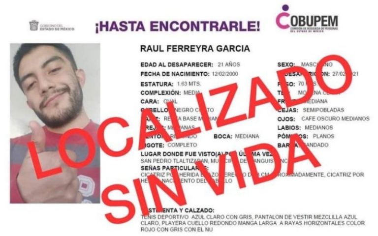 Toluca, Estado de México.- Tras más de 40 días desaparecido, familiares y autoridades del Estado de México informaron que encontraron muerto al joven taekwondoín Raúl Ferreyra García, de 21 años de edad.