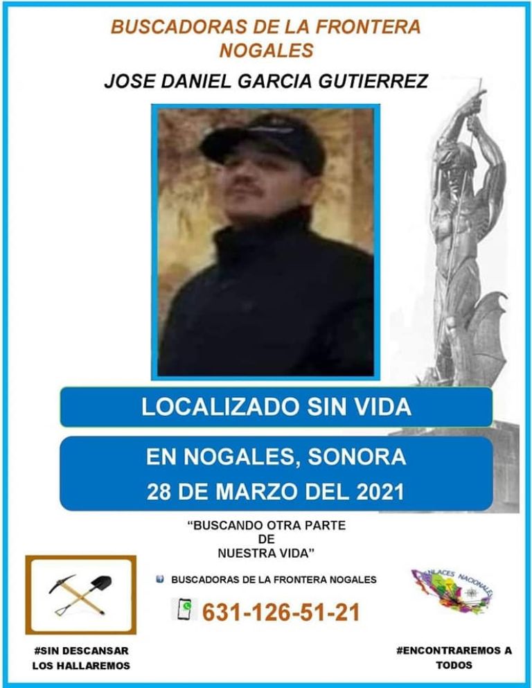 Nogales, Sonora.- El colectivo Buscadoras de la Frontera Nogales informó que el cuerpo sin vida de José Daniel García Gutiérrez fue encontrado tras varios meses en los que permaneció en calidad de desaparecido en su natal Nogales.