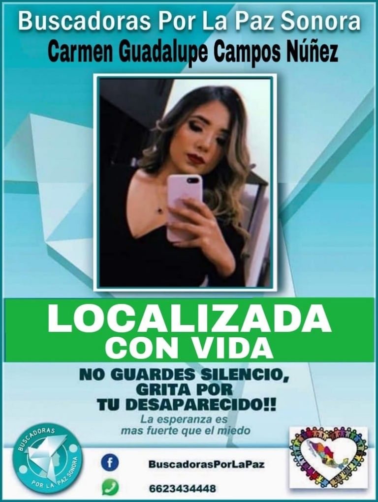 Hermosillo, Sonora.- La tarde de este sábado se confirmó que Carmen Guadalupe Campos Núñez, joven que había sido reportada como desaparecida este mismo día, fue localizada sana y salva en su natal Hermosillo.