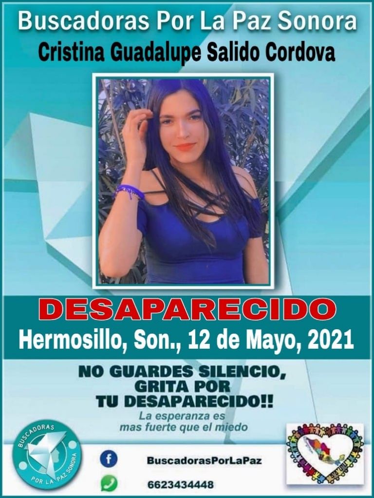 Hermosillo, Sonora.- Este sábado 15 de mayo se informó que la joven Cristina Guadalupe Salido Córdova, de 15 años de edad, se encuentra en calidad de desaparecida desde hace varios días en su natal Hermosillo.