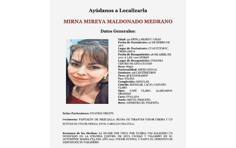 Mirna había sido vista por última vez en la ciudad de Cuauhtémoc, Chihuahua; no obstante, su cadáver apareció en las inmediaciones del municipio de Santa Isabel, dentro de una brecha del lugar conocido como 'La Laborcita de San Javier'.