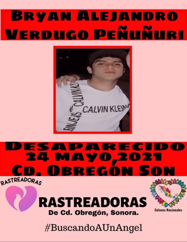 Fue su madre, Marisela Peñúñuri, quien reportó el extravío de Bryan Alejandro por medio de su cuenta de Facebook, en donde reveló que la última vez que se le vio fue el 24 de mayo de 2021 en Esperanza, Sonora.