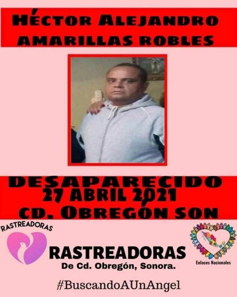 Ciudad Obregón, Sonora.- Este lunes, el colectivo Rastreadoras de Ciudad Obregón informó sobre la desafortunada desaparición de Héctor Alejandro Amarrillas Robles, hombre de quien no se sabe nada desde hace varios días.