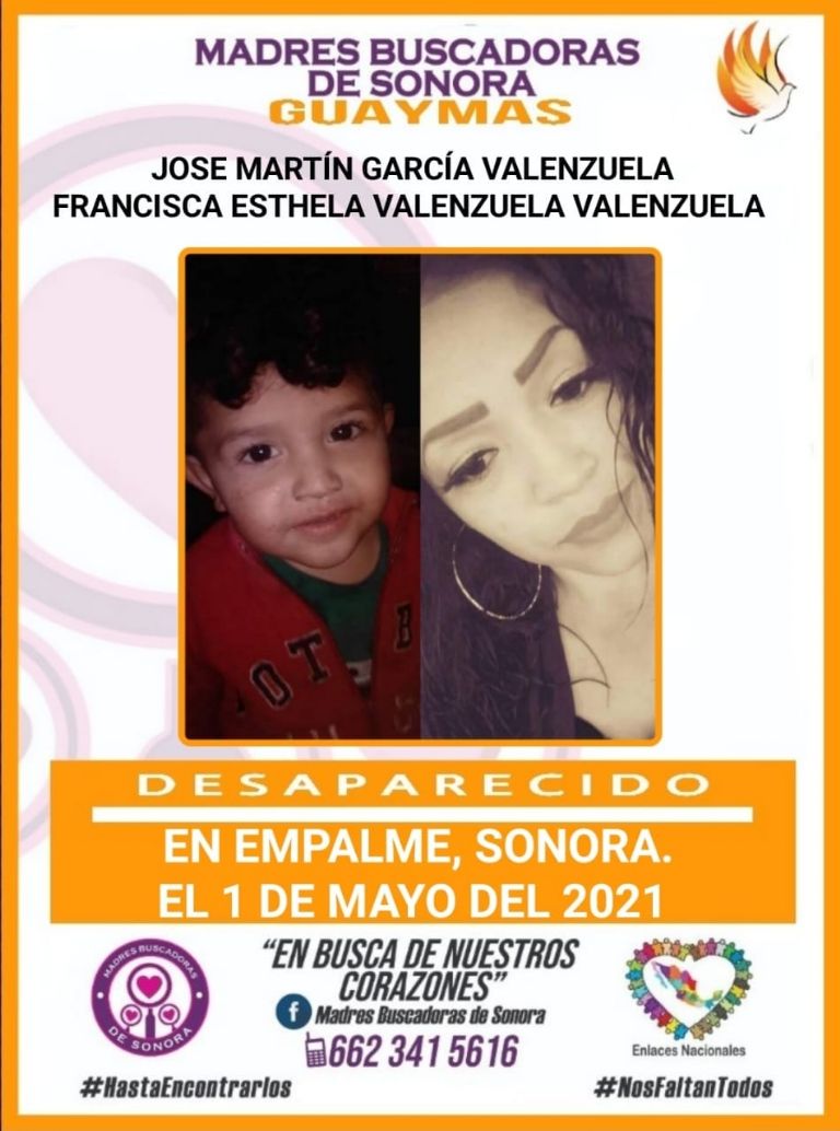 A través de redes sociales, el grupo de mujeres compartió la ficha de búsqueda de madre e hijo, quienes responden a los nombres de Francisca Esthela Valenzuela de 28 años de edad y José Martín García Valenzuela de 2 años.