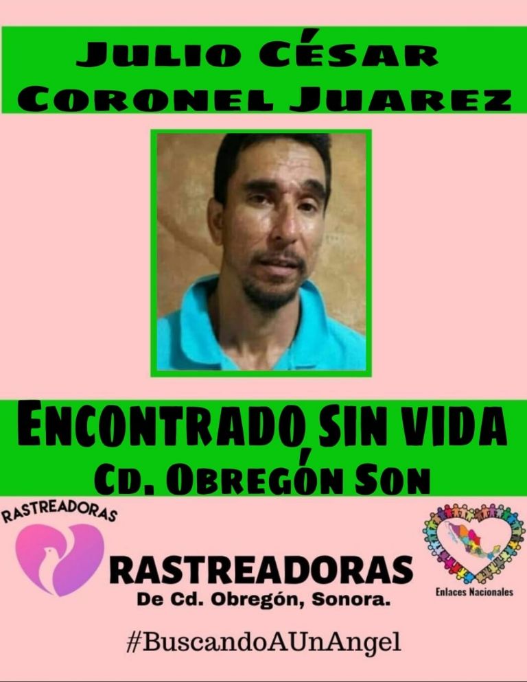 Ciudad Obregón, Sonora.- La noche de ayer viernes, el colectivo Rastreadoras de Ciudad Obregón informó que el cuerpo sin vida de Julio César Coronel Juárez fue encontrado tras su lamentable desaparición en Ciudad Obregón.