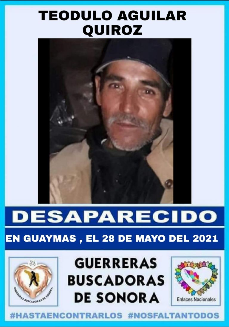Guaymas, Sonora.- El colectivo Guerreras Buscadoras de Sonora reveló este lunes 14 de mayo que el señor Teodulo Aguilar Quiroz, residente de Guaymas, se encuentra en calidad de desaparecido desde hace varias semanas.