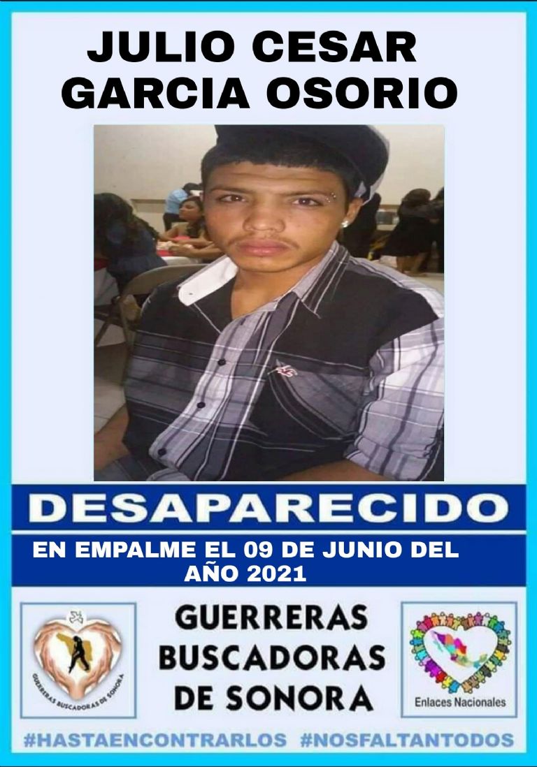 Empalme, Sonora.- El colectivo Guerreras Buscadoras de Sonora reveló este viernes 18 de junio que el joven Julio César García Osorio se encuentra en calidad de desaparecido desde hace varios días en la ciudad de Empalme.