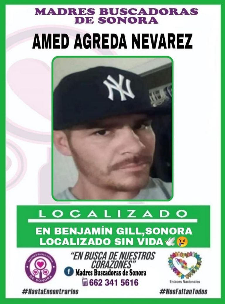 Benjamín Hill, Sonora.- El colectivo Madres Buscadoras de Sonora reveló este sábado 19 de junio que Amed Agreda Nevárez fue localizado sin vida luego de varios días desaparecido en el municipio de Benjamín Hill, Sonora.