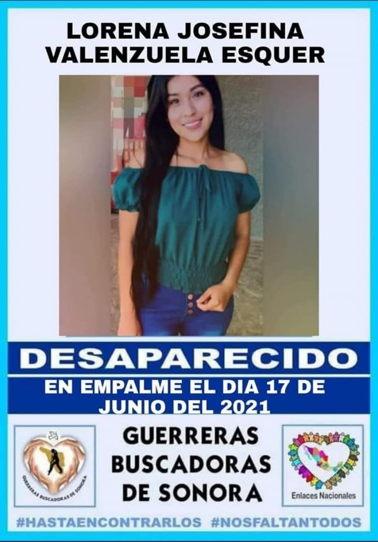 Lorena Josefina Valenzuela Esquer de 24 años fue vista por última vez a las afueras de Maquilas Tetakawi, donde labora en Empalme, el pasado jueves 17 de junio. Desde ahí se perdió todo contacto con ella.