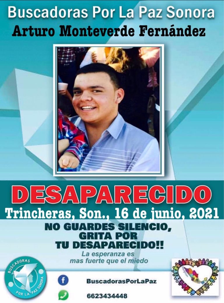 Trincheras, Sonora.- El colectivo Buscadoras por la Paz reveló este jueves 24 de junio que el joven Arturo Monteverde Fernández, residente de Trincheras, Sonora, se encuentra en calidad de desaparecido desde hace varios días.