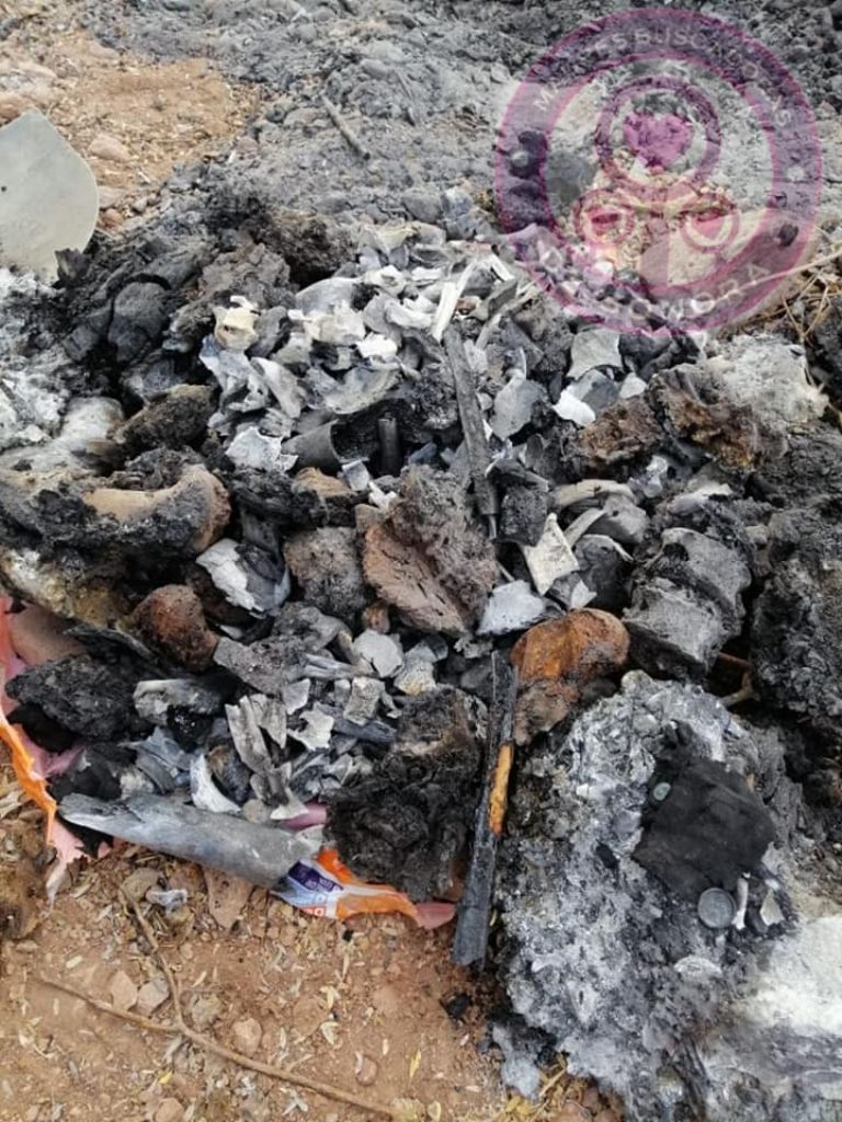 A través de redes sociales, el grupo de mujeres detalló que se trata huesos humanos totalmente calcinado, los cual fueron descubiertos este mismo día en un predio enmontado cercano a la comunidad de Ortiz.