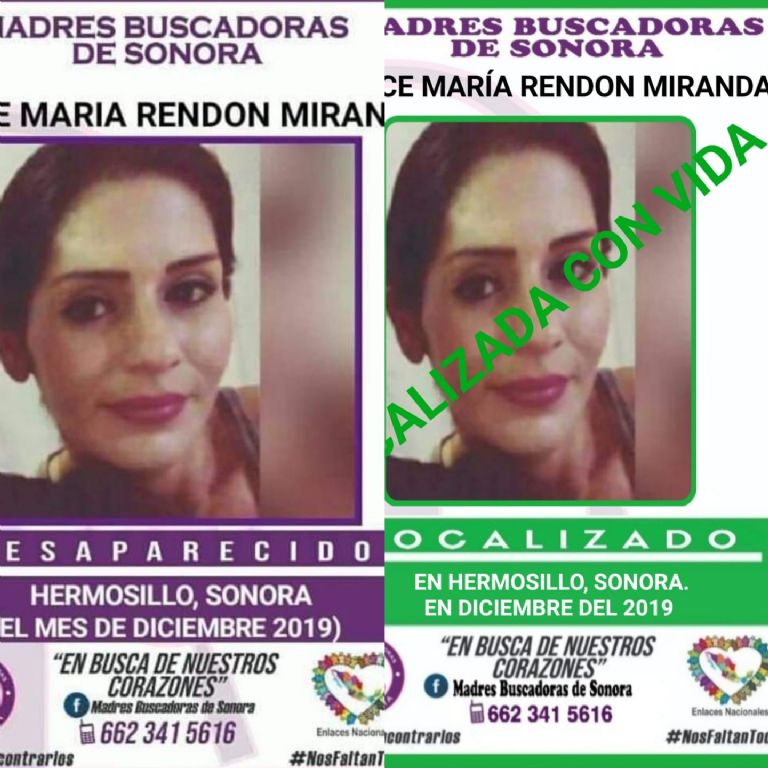 Hermosillo, Sonora.- Este lunes 7 de junio, el colectivo Madres Buscadoras de Sonora informó que Dulce María Rendón Miranda fue localizada sana y salva luego de haber sido reportada como desaparecida hace poco menos de 2 años.