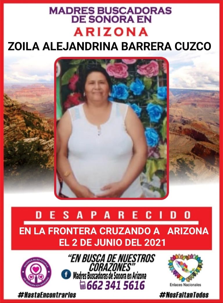 Nogales, Sonora.- Desde hace varios días que nada se sabe de la señora Zoila Alejandra Barrera Cuzco, quien se encuentra en calidad de desaparecida luego de cruzar la frontera mexicana de Sonora hacia Arizona.