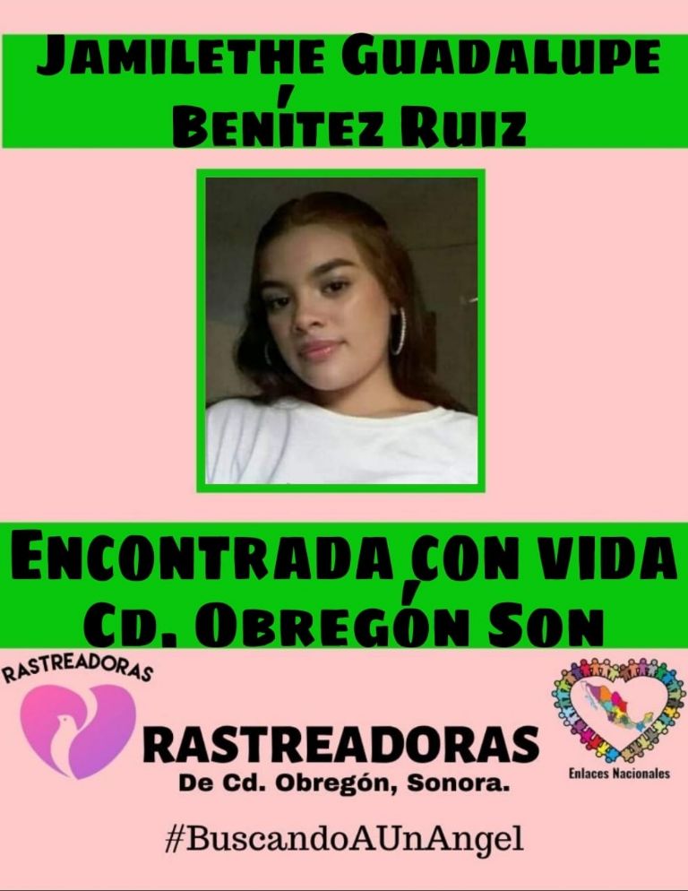 Fue colectivo de mujeres, Rastreadoras de Ciudad Obregón, quien mediante sus redes sociales confirmó que Jamilethe Guadalupe fue encontrada sana y salva y ya se encuentra de regreso en su hogar, al lado de su familia.
