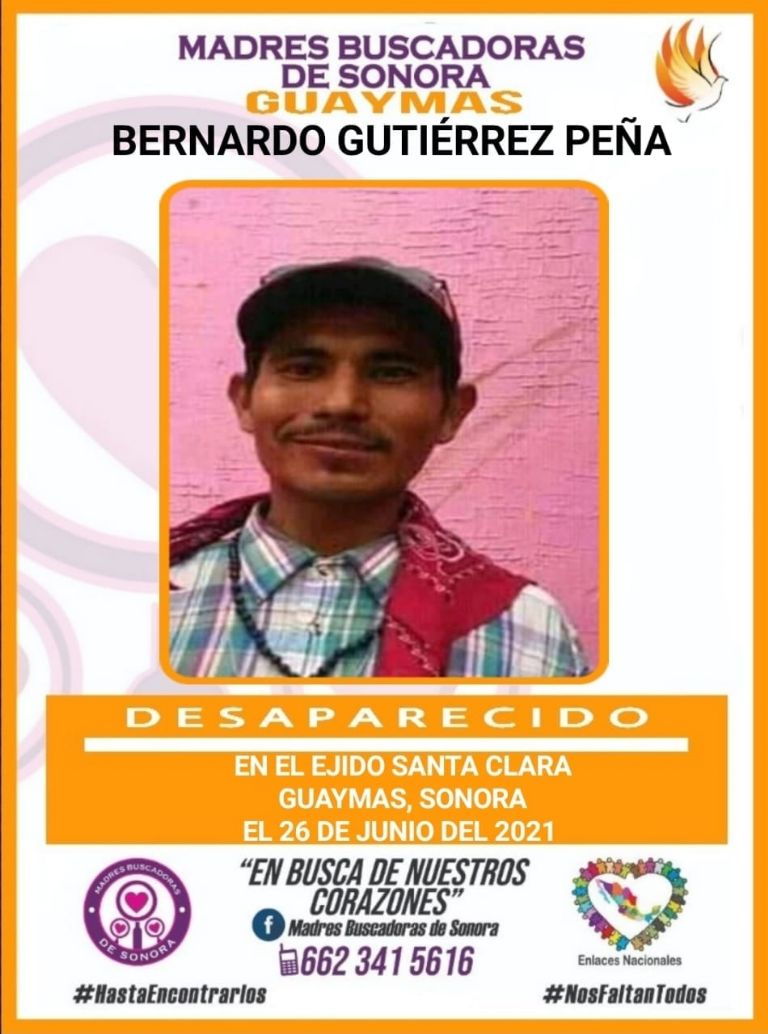 Guaymas, Sonora.- Este jueves 1 de julio, el colectivo Madres Buscadoras de Sonora informó sobre la infortunada desaparición del señor Bernardo Gutiérrez Peña, de quien nada se sabe desde hace varios días en el municipio de Guaymas.