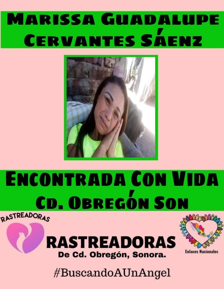 Ciudad Obregón, Sonora.- La mañana del sábado 9 de julio, el colectivo Rastreadoras de Ciudad Obregón reveló que la señora Marissa Guadalupe Cervantes Sáenz fue encontrada con vida luego de su repentina desaparición.