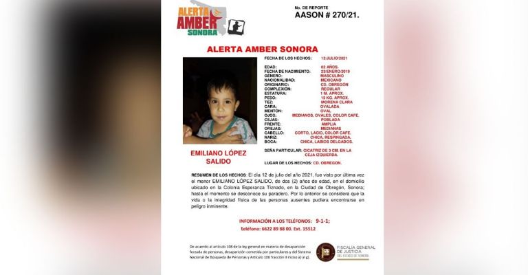 Se sabe que el pequeño fue visto por última vez el pasado 12 de julio en su domicilio de la colonia Esperanza Tiznado, al sur de Ciudad Obregón, en el estado de Sonora.