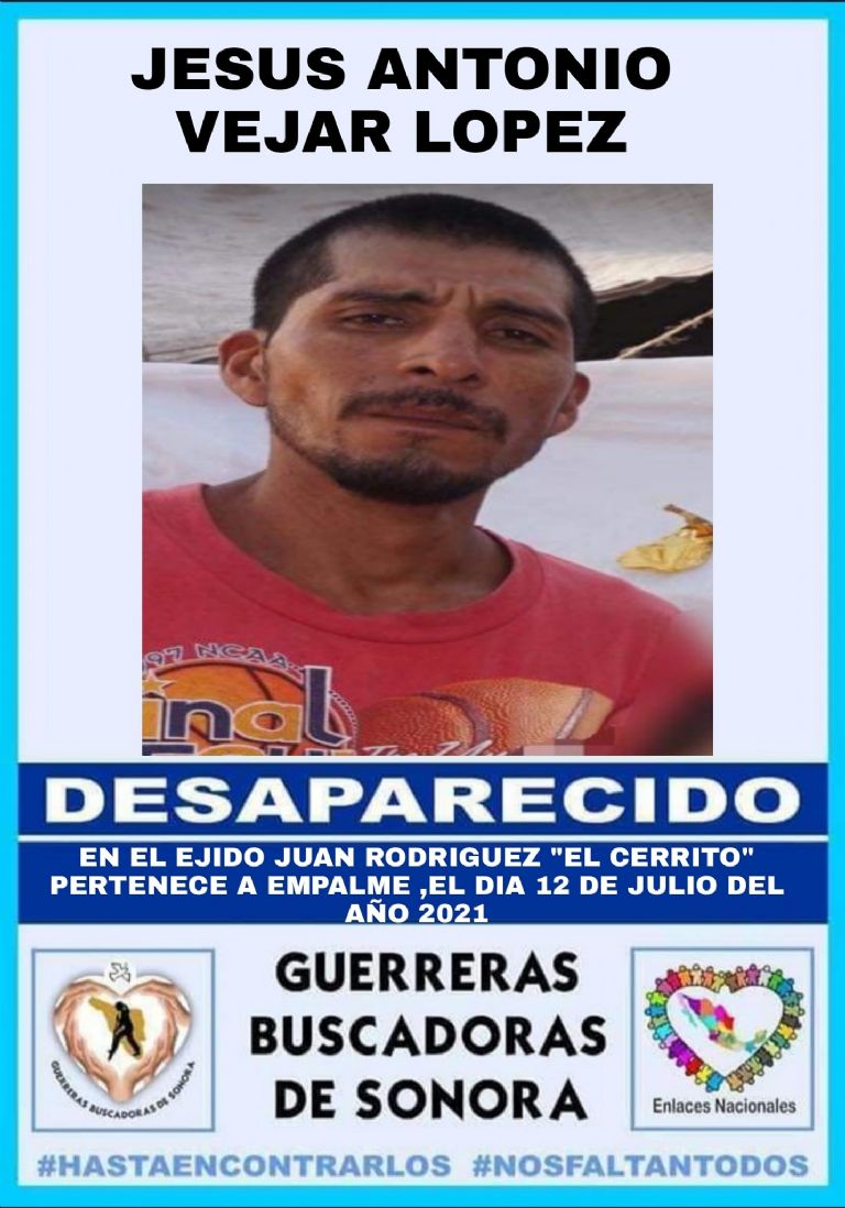 Empalme, Sonora.- El colectivo Guerreras Buscadoras de Sonora reveló este jueves 15 de mayo que Jesús Antonio Vejar López se encuentra en calidad de desaparecido desde hace varios días en el municipio de Empalme.