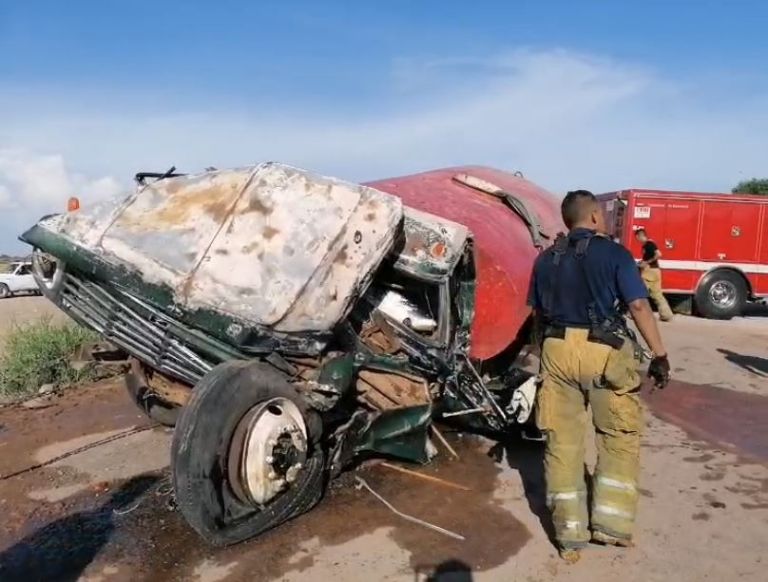 San Ignacio Río Muerto, Sonora.- Un fuerte accidente vehicular fue el que se suscitó la tarde de este sábado 17 de julio en el Valle del Yaqui, donde los tripulantes de una camión cisterna quedaron prensados y con heridas de consideración.