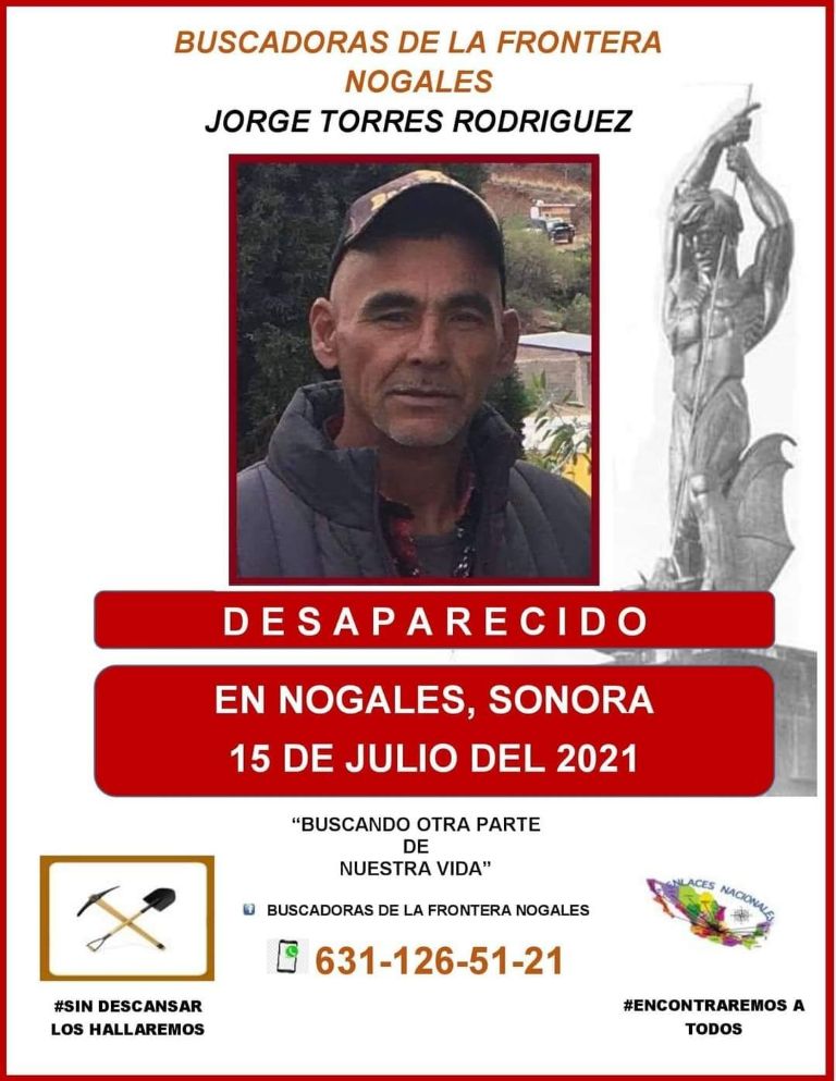 Nogales, Sonora.- La tarde de este domingo 18 de julio, el colectivo Buscadoras de la Frontera Nogales reportó la desaparición del señor Jorge Torres Rodríguez, quién tiene varios días extraviado en la ciudad de Nogales.