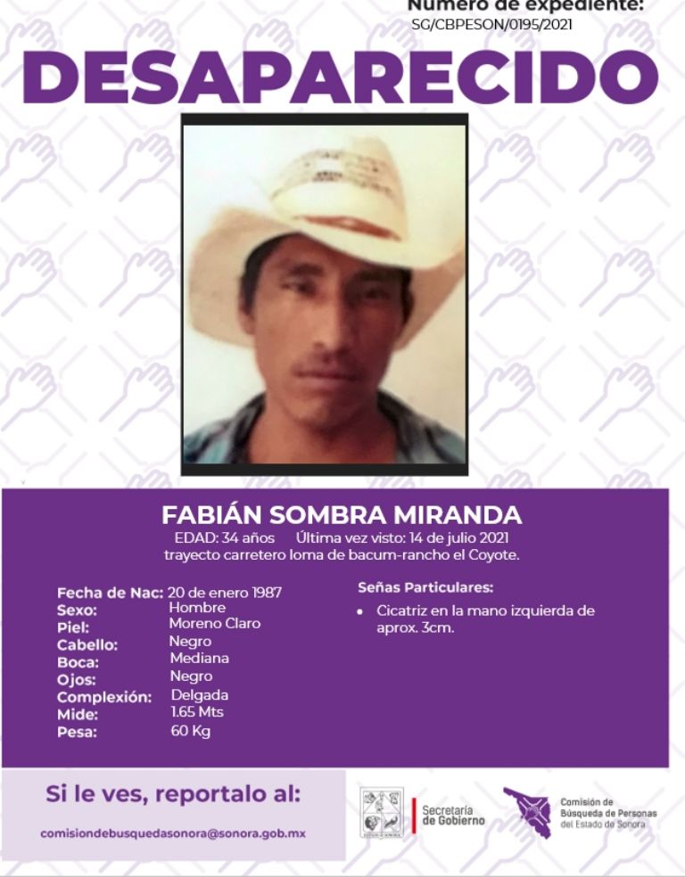 La última vez que las ocho personas fueron vistas fue el 14 de julio de 2021 y aunque no especificó si viajaban juntas, se sabe que por lo menos tres de ellas desaparecieron en el trayecto carretero del rancho El Coyote a la comunidad Loma de Bácum.