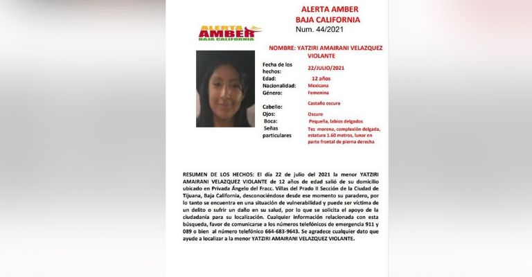 Tijuana, Baja California.- La menor Yatziri Amainari Velázquez Violante, de 12 años de edad, desapareció al salir a calles de Tijuana, por lo que la Fiscalía General de Baja California activó una Alerta Amber.