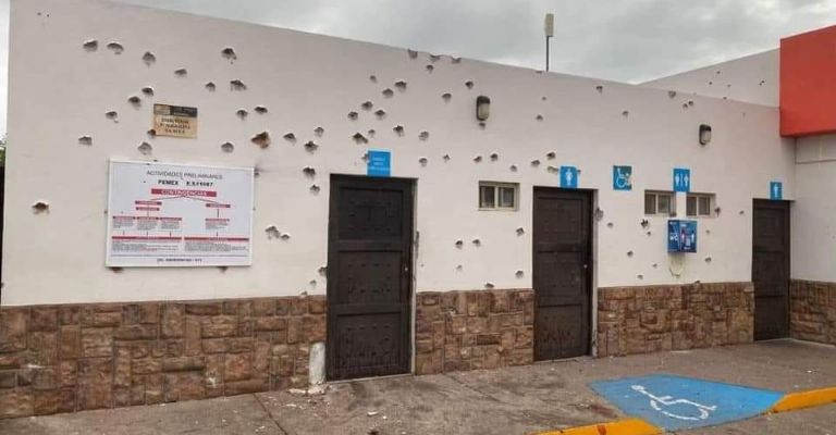 También se difundió una imagen que muestra cómo quedó la fachada de unos baños en una gasolinera y a simple vista se aprecian decenas de enormes orificios provocados por los disparos.