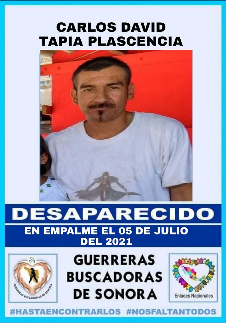 Empalme, Sonora.- En días recientes, colectivos de búsqueda como Guerreras Buscadoras de Sonora informaron sobre la desaparición del señor Carlos David Tapia Plascencia, de quien nada se sabe desde hace varias semanas en Empalme.