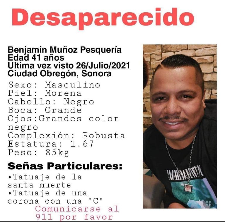 Se trata del señor Benjamín Muñoz Pesqueira, el cual fue visto por última vez el lunes 26 de julio de 2021 cuando salió de su vivienda y ya no regresó; hasta el momento nada se sabe nada de su paradero.