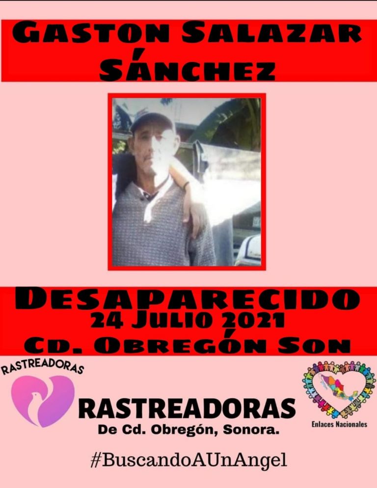Ciudad Obregón, Sonora.- El colectivo búsqueda de personas desaparecidas Rastreadoras de Ciudad Obregón informó sobre la desaparición del señor Gastón Salazar Sánchez, quien es es buscado por sus familia en el municipio de Cajeme.