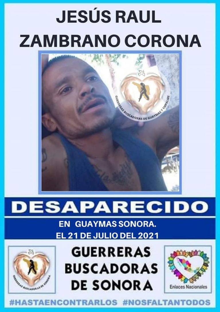 A través de redes sociales, el colectivo Guerreras Buscadoras de Sonora compartió la ficha de búsqueda de Jesús Raúl Zambrano Corona y pidió la colaboración de las personas para encontrarlo sano y salvo.
