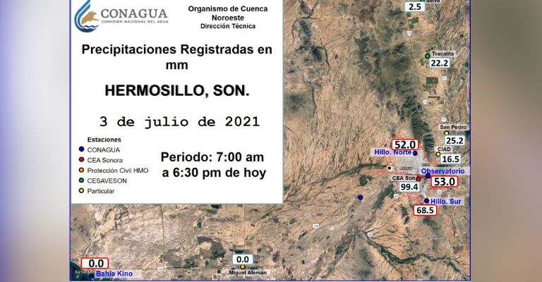 El servicio meteorológico privado GlobalMet, publicó en redes sociales que sus estaciones de medición registraron los siguientes niveles: Estadio Sonora 80.3 milímetros; San Pedro 24.1 milímetros; CIAD 15.5 milímetros y Unison 41.4 milímetros.