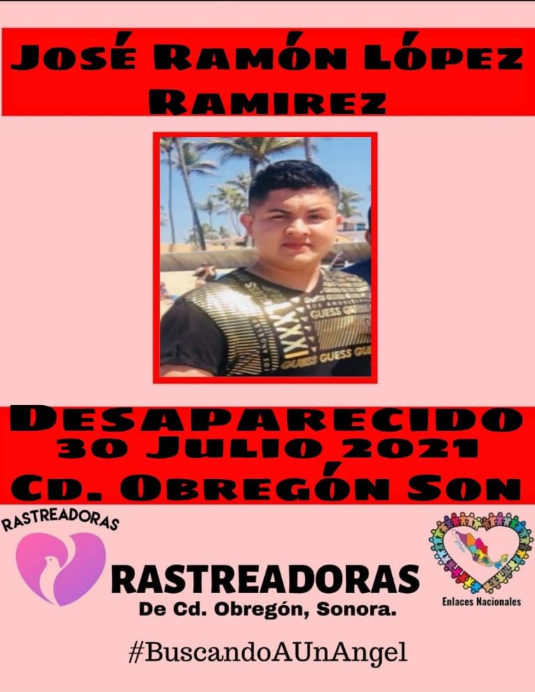 Ciudad Obregón, Sonora.- Desde hace varias horas que nada se sabe del joven José Ramón López Ramírez, quien se encuentra en calidad de desaparecido en su natal Ciudad Obregón, Sonora, donde es buscado por sus familiares y amigos.