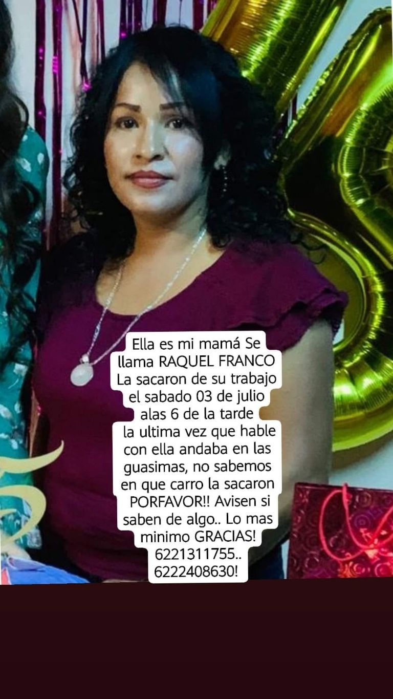 Hola su nombre es Raquel Franco y la estamos buscando si alguien la a mirado le pido con el corazón en la mano que me lo han saber. Su familia la espera", escribió.