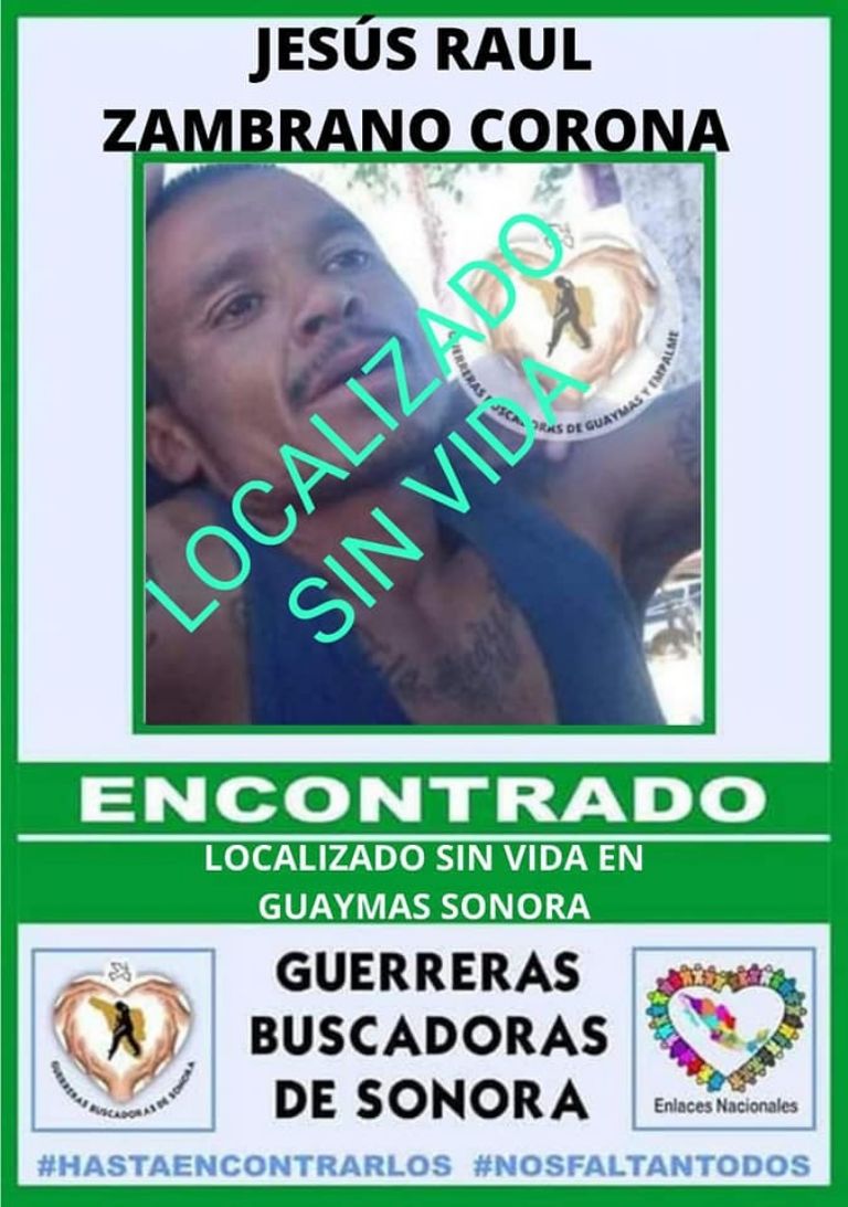 A través de redes sociales, el colectivo Guerreras Buscadoras de Sonora compartió la triste noticia del hallazgo del cuerpo de Jesús Raúl Zambrano Corona, el cual presentaba signos de violencia e impactos de bala.