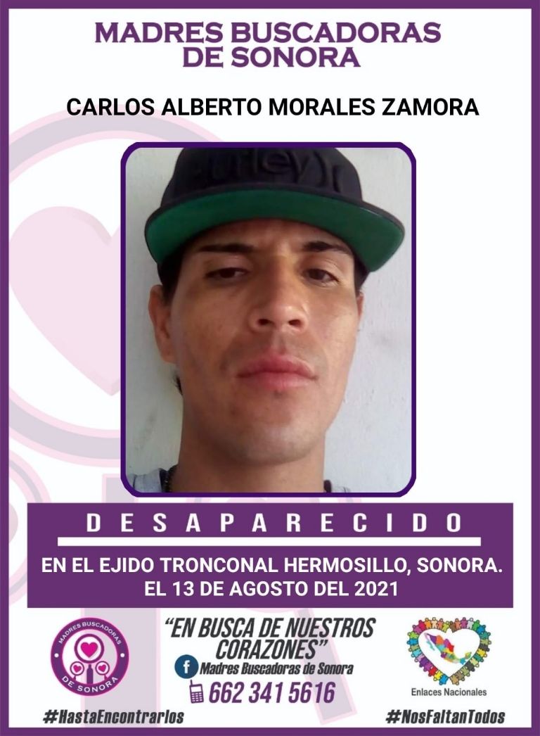 Hermosillo, Sonora.- El colectivo Madres Buscadoras de Sonora reportó la desaparición de Carlos Alberto Morales Zamora, quien se encuentra desaparecido desde hace varios días en el municipio de Hermosillo, Sonora.