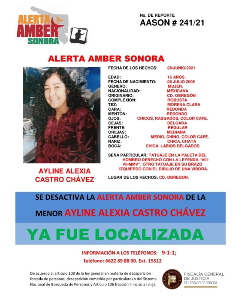 Con esta noticia se desactivó la Alerta Amber en Sonora que había sido puesta en circulación ayer martes, después de que sus familiares acudieran ante la Fiscalía General de Justicia del Estado para levantar una denuncia por su repentino extravío.