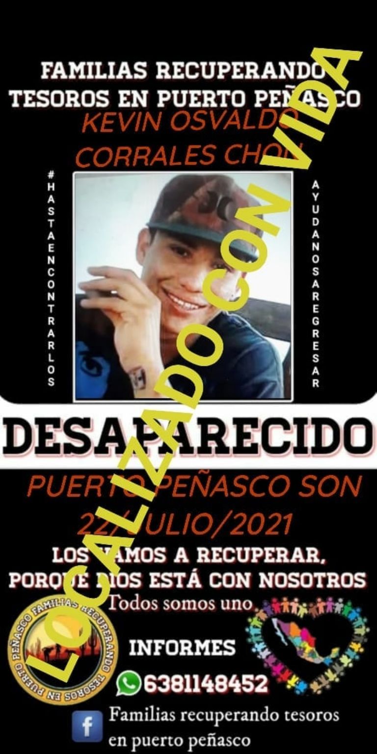 Puerto Peñasco, Sonora.- El pasado viernes 20 de agosto se confirmó que la joven Kevin Osvaldo Corrales Chon fue localizado con vida, el cual se encontraba en calidad de desaparecido desde hace varias semanas Puerto Peñasco, Sonora.