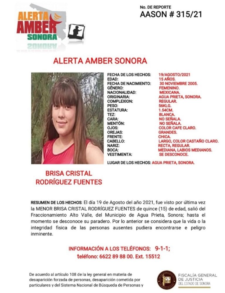 Agua Prieta, Sonora.- Ayer sábado 21 de agosto se activó la Alerta Amber en Sonora para encontrar a Brisa Cristal Rodríguez Fuentes, menor de edad que desapareció hace varios días en el poblado fronterizo de Agua Prieta.