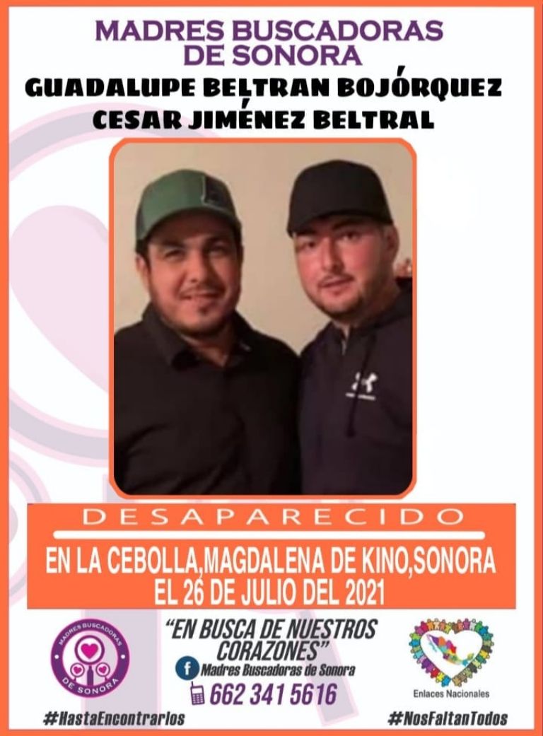 Los extraviados responden a los nombres de Guadalupe Beltrán Bojórquez de 38 años de edad y César Jiménez Beltrán de 26. Aquél día, viajaban en carretera de la comunidad de La Cebolla hacia Hermosillo por motivos de trabajo.