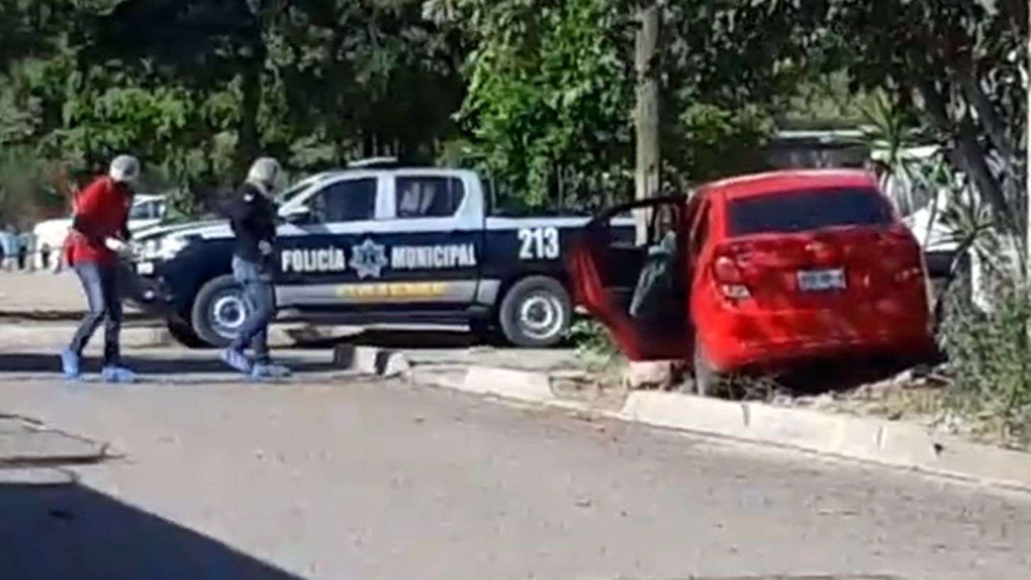 Según los primeros reportes, la víctima intentaba huir de presuntos gatilleros, pero fue alcanzada por las balas estrellado la unidad contra un poste y quedando arriba de la banqueta.