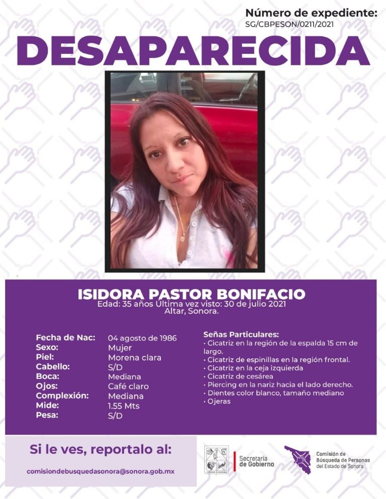 Altar, Sonora.- La Comisión de Búsqueda de Personas del Estado de Sonora informó la tarde de este jueves 5 de agosto sobre la lamentable desaparición de la madre de familia Isidora Pastor Bonifacio en el municipio de Altar, Sonora.