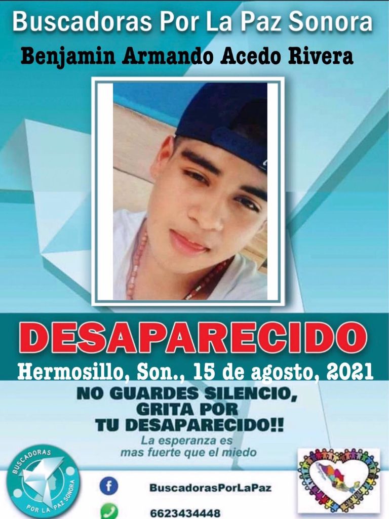 "Ando en busca de mi hijo, se llama Benjamín Armando Acedo Rivera, ya 2 dos semana que no sabemos de él. Si sabes algo por favor comunícate a los números 6621043182 y 6623435414, estamos desesperados", escribió su madre en Facebook.