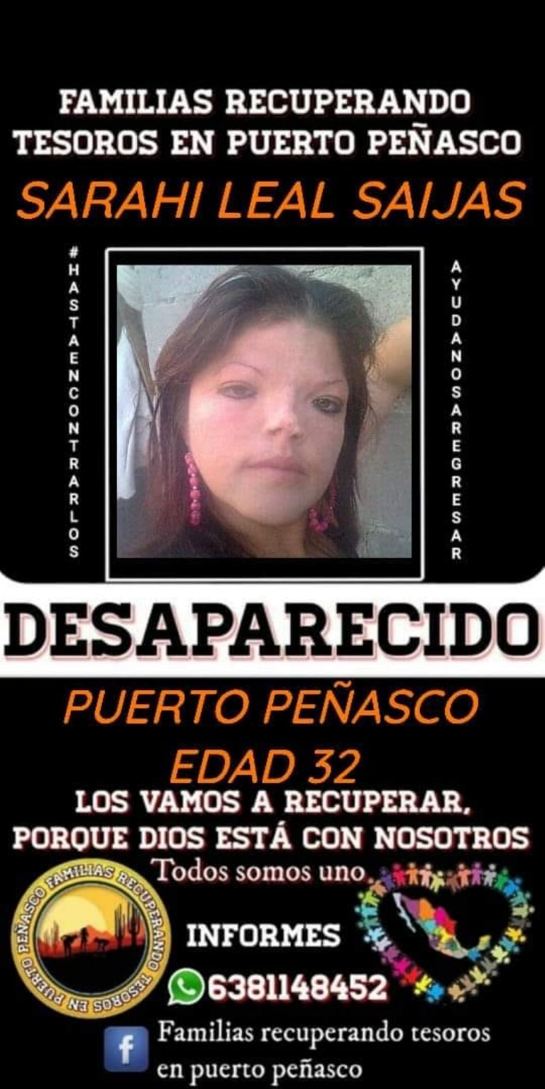 Hermosillo, Sonora.- El colectivo Familias Recuperando Tesoros en Puerto Peñasco solicita la ayuda de la comunidad para encontrar a Sarahí Leal Saijas, quien se encuentra en calidad de desaparecida desde hace varios días en Puerto Peñasco, Sonora.