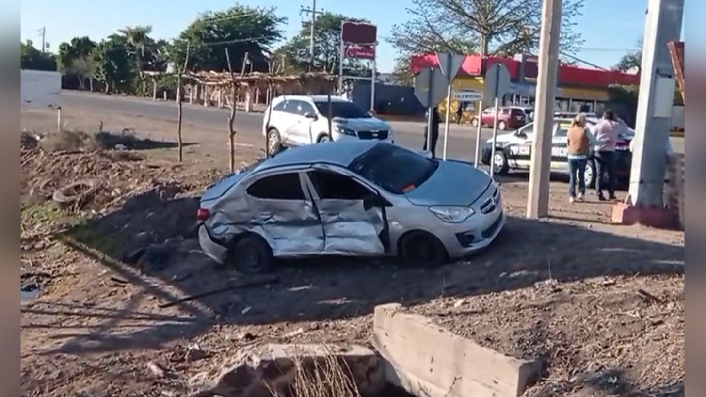 Ciudad Obregón, Sonora.- La tarde de este viernes 14 de enero, al sur de Ciudad Obregón, se registró un aparatoso choque en el cual un automóvil tipo sedán terminó por caer en un dren.
